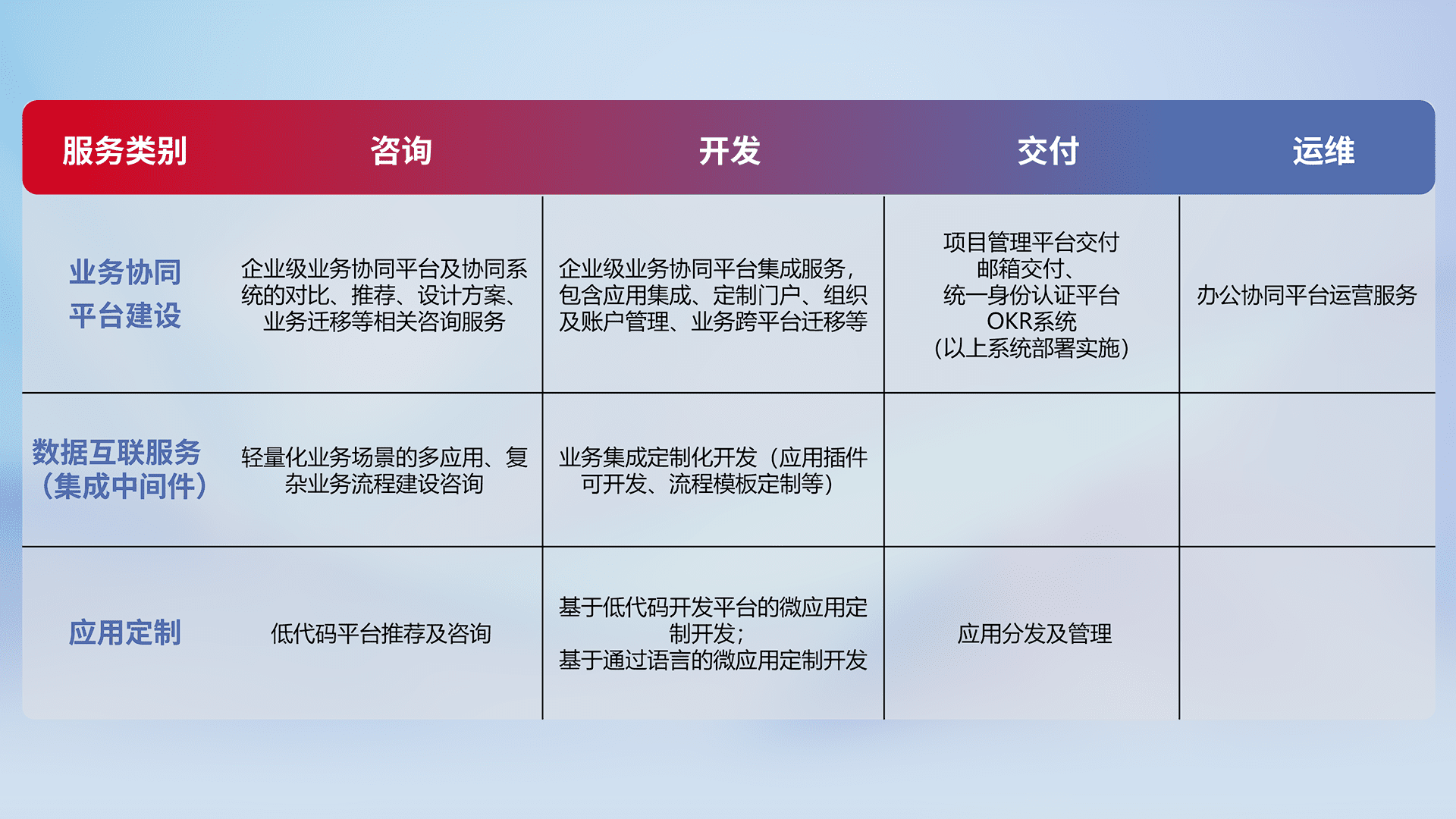 针对钉钉、、、、企微、、、、IDaas等平台级产品提供产品的规划、、、、方案、、、、交付、、定制化开发等服务,,,,实现如统一协同办公、、智能客户服务、、混合会议管理、、、、智能数据查询、、、、等业务场景,,,,实现数字化转型。。。。