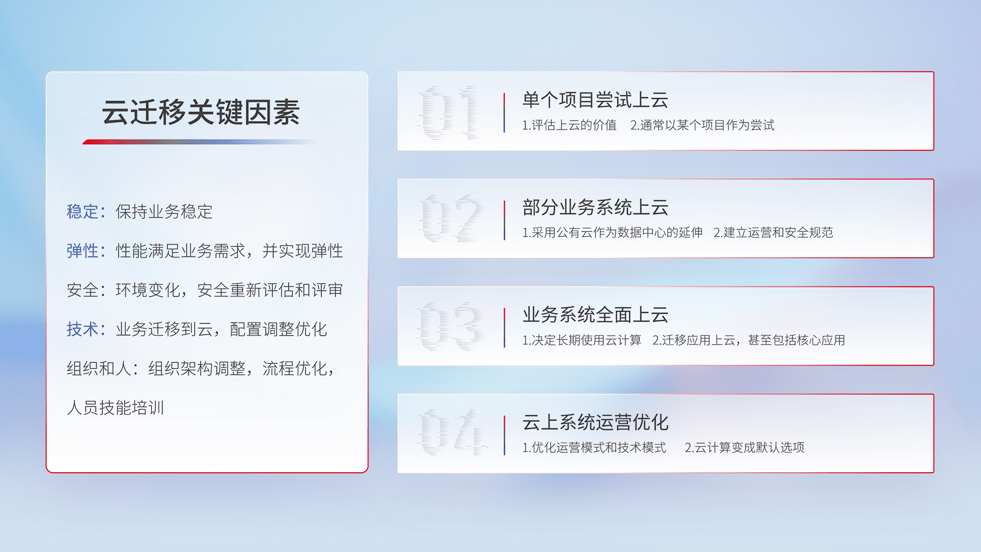 结合实际业务,,,,从规划设计、、、、云平台选型、、、云原生改造、、数据迁移、、、、集成交付,,,迁移全过程为客户识别最佳上云路径,,,做好风险识别管理,,,设计网络架构、、、、身份权限、、、、安全审计合规、、操作审计、、日志审计、、、监控告警策略、、、多站点容灾设计等,,,,对云上基础设施进行整体规划,,提升IT治理水平,,,以满足弹性、、、高可用、、高性能的需求。。。