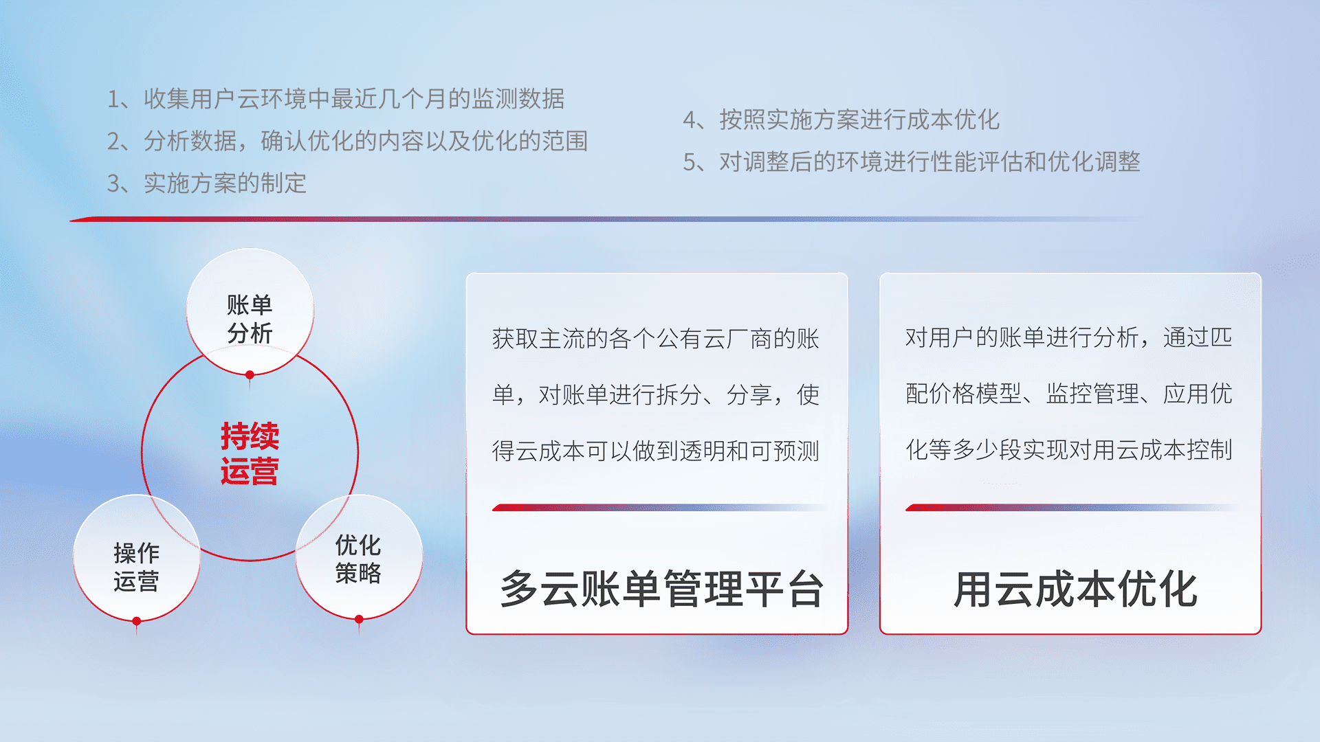 通过多云纳管,,,以统一的资源数据模型把客户的云资源进行抽象和封装,,进而实现对多云资源的统一操作,,,,保障云资源管理的可靠性、、稳定性与可用性。。量身定制化运维内容,,,配置、、开发运维、、、、补丁管理、、备份、、、监控、、认证和访问管理、、、审计和日常巡检等,,,,保障在用云过程中的可靠度,,,稳定度以及高可用率。。。。